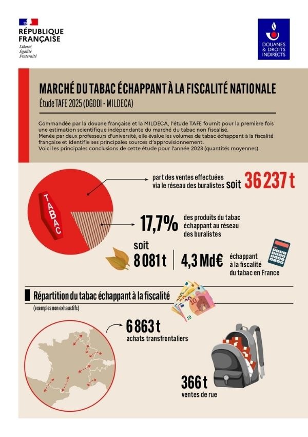 De acordo com o estudo TAFE 2025, publicado a 31 de outubro de 2025 pela Direção-Geral das Alfândegas e Direitos Indiretos (DGDDI) em parceria com a MILDECA (Missão Interministerial de Luta contra as Drogas e Condutas Aditivas), cerca de 17,7% do tabaco consumido em 2023 escapou à fiscalidade nacional, o que representa mais de 8 mil toneladas de produtos não tributados, traduzindo-se numa perda fiscal estimada de 4,3 mil milhões de euros.